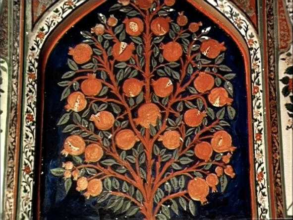 Красные плоды граната это сердце, кровь, лоно любимой, страсть и вкус лобзаний. Любовных и сестринских. Красный нить жизни, потому он повсеместно присутствует в фильме, а в финале, когда Ашик-Кериб понимает, что пора возвращаться домой, он одет в чисто красное платье, беспримесный красный цвет собственного существования.