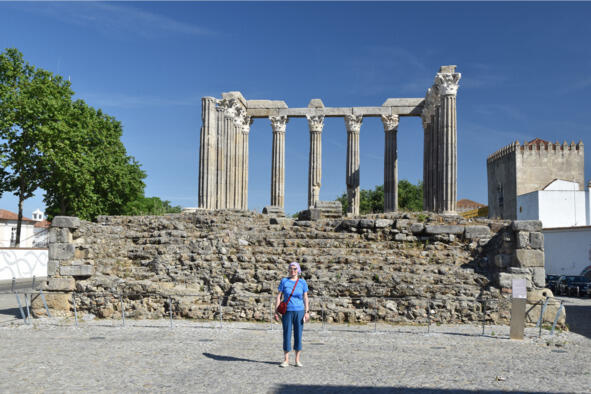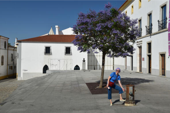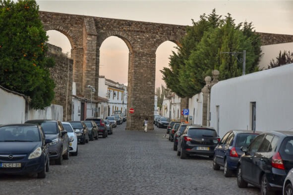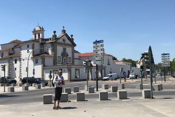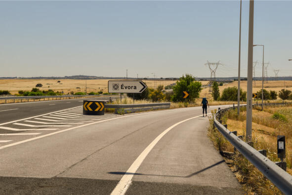 Нас высадили в 10 км от Эворы (Évora) около 16:00 возле развязки-съезда на платную дорогу IP2. Но не успели ноги коснуться асфальта, как мы тотчас были раздавлены удушающей жарой. Какой там Camino de Santiago, сил бы до поворота хватило! Первые метры оказались самыми сложными, солнце пекло неумолимо, превращая каждый шаг в бесконечный отрезок пути. Но постепенно приноровились, вошли в ритм. Даже поймать попутку попытались, но машины проносились мимо, притормаживая лишь на повороте, ныряя под эстакаду, да перед шлагбаумом-въездом на платную дорогу. Идти до Эворы по солнцепеку было опасно, а смена одежды давала лишь временное облегчение. Выручила наблюдательность и присутствие дежурного персонала на пункте пропуска. Английский был у них слабый, а португальским мы не владели, тем не менее, они нас поняли, вошли в положение и вызвали такси.