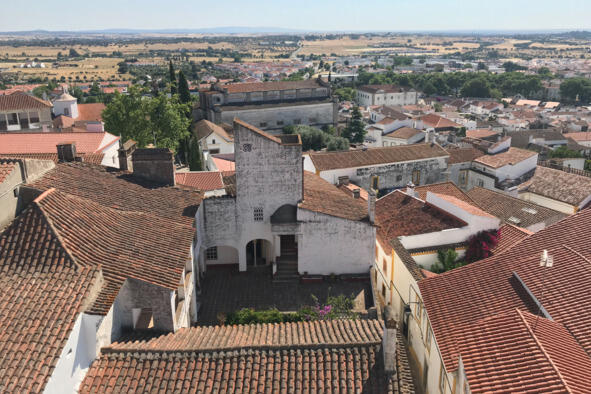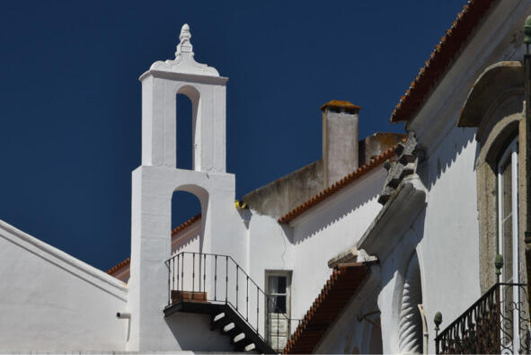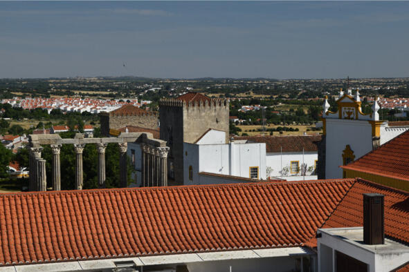 На следующий день нас ждал Лиссабон (Lisboa), поэтому на осмотр города оставалось не так уж и много времени, как если бы мы пробыли там дня два или три. Именно столько требуется, чтобы охватить все исторические места Эворы, включая расположенный за его чертой с севера женский монастырь Cartuxa 1587 года и форт Santo António da Piedade XVII века. Но если эти объекты не так заметны на фоне руинированных построек и зарослей, то опоры акведука Серебряной Воды (Água de Prata) XVI века, растянувшегося на 3 км из центра города до монастыря São Bento de Cástris XIII века, видны издалека. А еще бескрайние поля и небольшие деревушки. Однако стоит повернуть обратно, назад к городским стенам, как картинка тотчас меняется. Беленые стены домов с кованой обрешеткой ложных балконов, шафрановое обрамление дверей, окон и арок, рыжая черепица и булыжная мостовая. Все это в сочетании с пышным цветением пурпурной бугенвиллеи и синей жакаранды придает городу в летние дни неповторимое очарование.