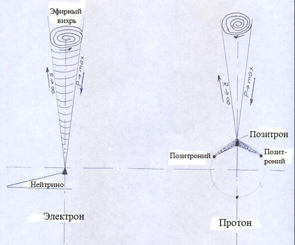 Итак, электрон-нейтрино с Эфирным вихрем. Протон-конструкция, в основе решетки которого расположены дуэнейтрино. Гравитационное поле протона и электрона это Эфирные вихри конусной формы. Собственно, это и есть заряд протона и электрона. Отличие заключается только в том, что вращение вихрей имеет разное направление, Рис.38. Если удалить электрон с орбиты протона в каждом атоме, то тело будет заряжено положительно, причём заряд не будет центрально симметричным, т.е. будет повторять контуры тела. У шара заряд будет иметь форму шара, на плоской поверхности заряд будет иметь форму плоскости.
