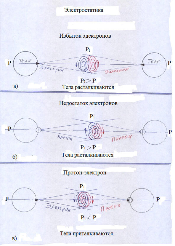 Электростатика проста. На Рис.40 изображено взаимодействие зарядов. Когда взаимодействуют два Эфирных вихря электронов или протонов, то они вращаются навстречу друг другу, нагнетая между телами Эфир. Плотность Эфира между телами повышается и тела расталкиваются