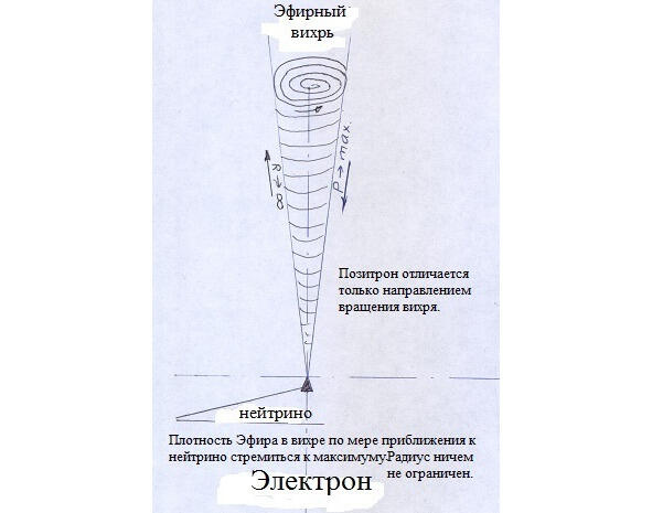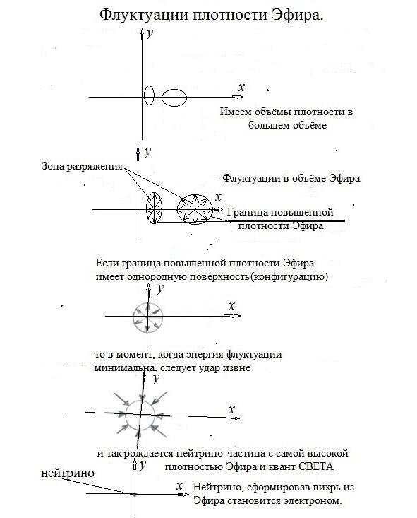 Изначально Эфир занимал весь объём и имел одинаковую плотность. Однако в этом объёме происходили флуктуации плотности Эфира. Смотрите Рис.1. И как следствие флуктуаций Эфира получилась дискретная частица Эфира-нейтрино с Эфирным вихрем, которая получила название электрон (позитрон) Рис 2.