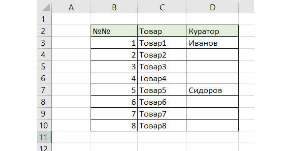 Конечно, такое решение возможно, если таблица маленькая. Если таблица содержит тысячи строк и сотни фамилий, то необходимо для решения задачи заполнения пустых ячеек использовать другие приемы, а именно приемы работы с группами ячеек.