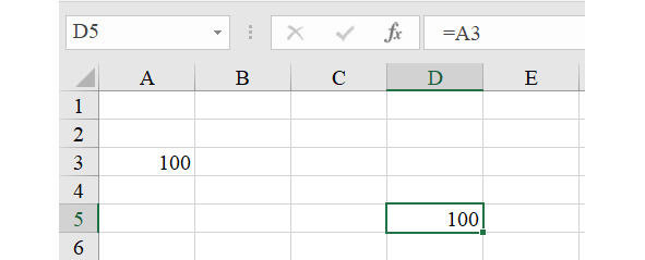 После ввода операции в ячейке D5 появилось число 100, то есть число, записанное в ячейке A3. Вид операции «=A3» можно видеть в строке формул справа вверху.