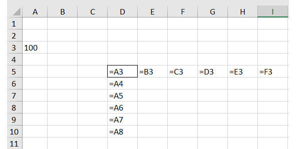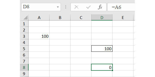 Рассмотрим такой пример. В ячейке D5 есть ссылка на ячейку А3, в которой находится число 100. Скопируем ячейку D5 и вставим в ячейку D8. Результат показан на Рис. 34.