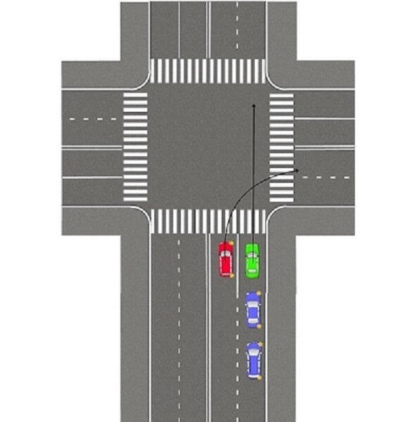 Водитель красной машины увидев, что в поворот направо стоит несколько машин не хочет стоять в очереди и решив, что все стоящие в правом ряду поворачивают направо, хочет объехать очередь слева.