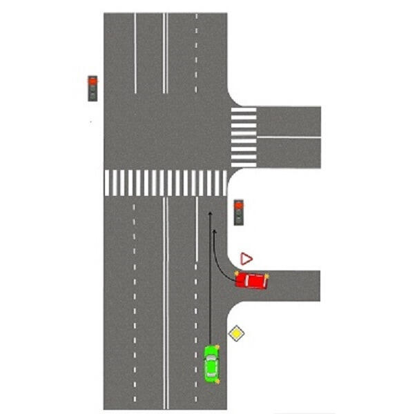 Вы (зеленая машина) хотите на перекрестке повернуть направо. Светофор красный.