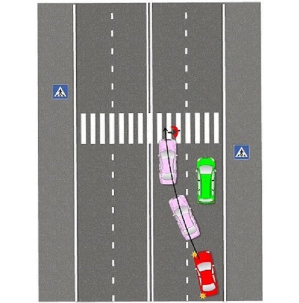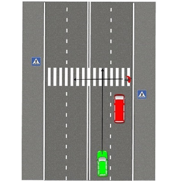 Водитель зеленой машины не видит пешехода, начинающего переход. Обзор закрыт красным автомобилем. Пешеход также не видит зеленую машину и спокойно идет через дорогу, уверенный в том, что его пропускают.