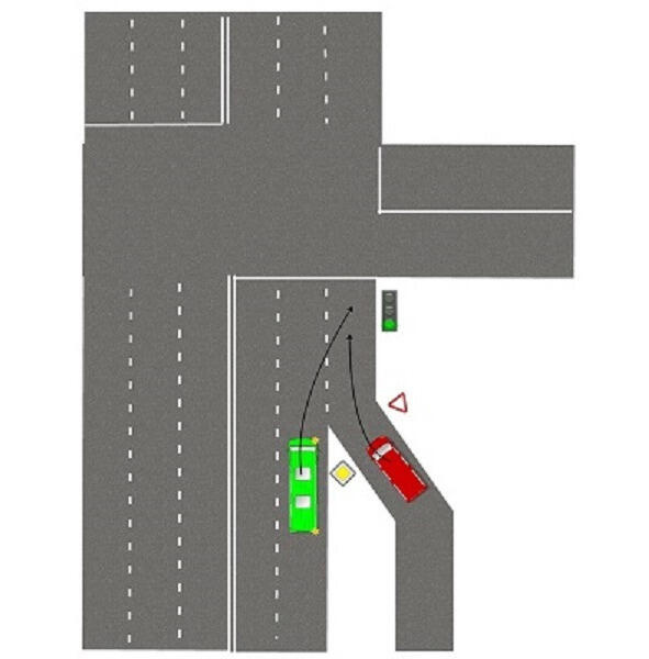 Водитель красного автомобиля решает, что Вы хотите заехать в проезд, откуда он выезжает и начинает движение. Вы же двигаетесь прямо.