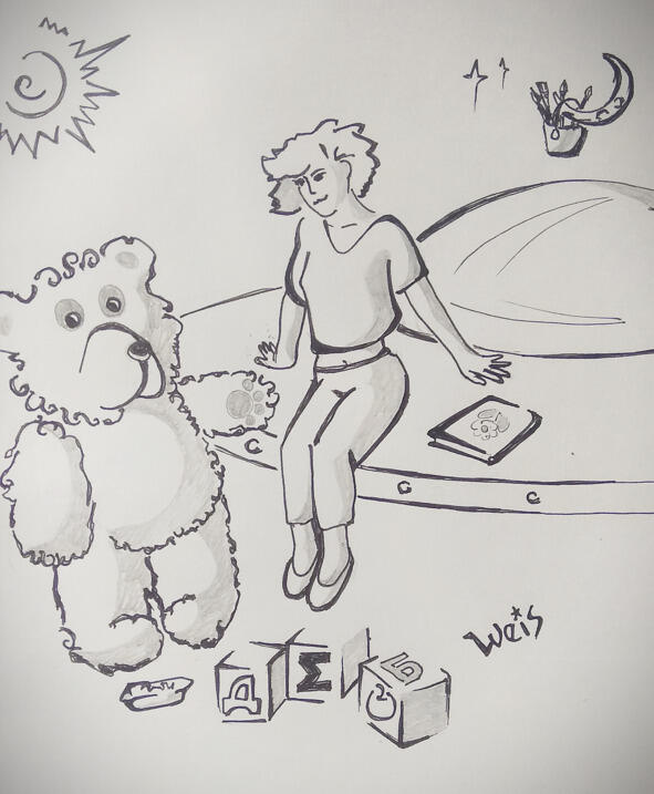 Этому подарку могли бы позавидовать все девушки мира! Во всяком случае, я никогда такого не видела ни до, ни после той встречи. Высоту от нижней до верхней полки занимал упакованный в прозрачный целлофан медведь. Он был голубым, только живот и ладошки были белыми. Его шерсть лежала колечками, как волосы у большинства кукол того периода. Из этой синтетической шёрстки очень легко делались когти: прядки разделялись на кончиках лап и укладывались воздушными кольцами! Нет-нет, она засмеялась, увидев изумление на лице собеседника, когти не были задуманы производителем, это не был трансформер, обычная мягкая игрушка, просто большая. Очень большая для того времени.