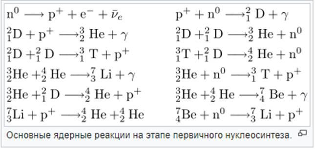 При температуре Т0,7 МэВ термодинамическое равновесие между протонами и нейтронами, существовавшее до этого, нарушается и отношение концентрации нейтронов и протонов застывает на значении 0,19. Начинается синтез ядер дейтерия, гелия, лития. Спустя ~200 секунд после рождения Вселенной температура падает до значений, при которых нуклеосинтез более невозможен, и химический состав вещества остаётся неизменным до момента рождения первых звёзд».