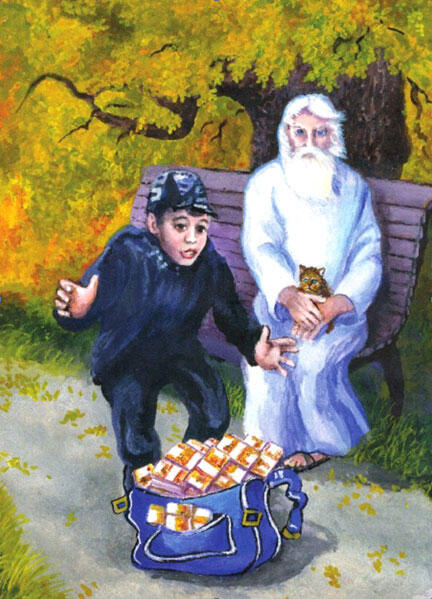 Пройдя больше половины городского парка, неподалёку от себя, под многовековым дубом на скамейке Ильяс увидел странного старичка в не менее странном белоснежном одеянии. Словно этот старичок был одет в большую ночную сорочку наподобие той, которую на ночь надевала его бабушка, только эта сорочка была с длинными рукавами и доходила ему чуть ли не до пят. Ещё не менее странным выглядело то, что на босых ногах этого чудотворца, словно сошедшего с иконы, были стоптанные старые сланцы. Но, несмотря на всё это в некотором роде комическое одеяние, далеко не по погоде, его светлое лицо с добрейшими глазами излучало покой и умиротворение. Сплошь седые длинные волосы развевались от небольших порывов ветра Довершалось это непонятное явление мяукающим неухоженным котёнком на его коленях.