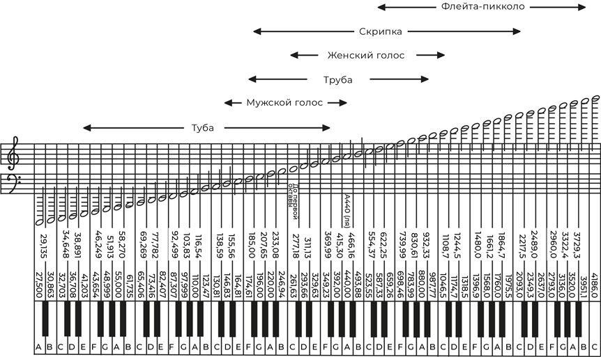 Ни одно животное не способно воспринимать высоту звука на всех существующих частотах, а цвета, которые мы видим, являются лишь небольшой частью электромагнитного спектра. Теоретически звук можно услышать при колебаниях от 0 до 100 000 циклов в секунду и даже более, но каждое животное воспринимает лишь ограниченный диапазон звуков. Люди, не страдающие потерей слуха, обычно способны слышать колебания от 20 до 20 000 Гц. Звуки в нижней части диапазона частот ближе к слабому гулу нечто подобное мы слышим, когда за окном проезжает грузовик (его двигатель производит звук на частоте около 20 Гц) или навороченный автомобиль с кастомной звуковой системой и мощными сабвуферами, работающими на большой громкости. Некоторые частоты ниже 20 Гц не слышны человеческому уху, оно физиологически их не воспринимает. Биты в песнях Фифти-Сента In da Club («В клубе») и Express Yourself («Выражай себя») группы N.W.A. расположены в нижней части доступного нам диапазона. В конце песни A Day in Life («День из жизни») в альбоме Sgt. Peppers Lonely Hearts Club Band («Оркестр клуба одиноких сердец сержанта Пеппера») The Beatles есть несколько секунд звука на частоте 15 кГц, который не слышит большинство людей старше 40 лет! (Если The Beatles считали, что не стоит доверять людям за сорок, возможно, это был такой своеобразный отсев, но говорят, что Леннон просто хотел взбодрить соседских собак.)