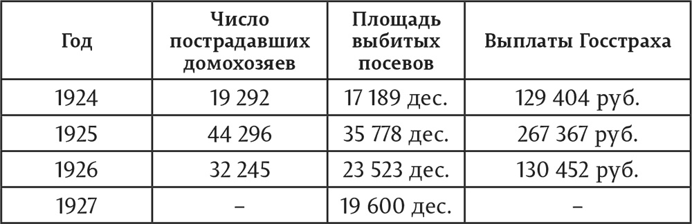 Этот факт не мог не обратить на себя внимания государства. Как следствие, Госстрахом были введены обязательное и добровольное страхование посевов. «Большой враг летом крестьянину град. В прошлом 1923 году от градобития пострадало 26.829 домохозяев, у которых повреждено 17.829,52 десятины озимых посевов и 4.737,38 десятин яровых посевов. За убытки уплачено вознаграждения 2.185.689 рублей совзнаками, информировала в 1924 г. нижегородская «Крестьянская газета». Все приведенные цифровые данные ярко говорят о том, как необходимо дальнейшее развитие дела Государственного Страхования для крестьянства и возражать против этого будет разве только самый несознательный человек, или же непримиримый враг Советской власти». [Док. 13]. Неизвестно, сколько было в деревне врагов у Советской власти, но «несознательных» хозяев хватало. Известная поговорка «Пока гром не грянет, мужик не перекрестится» носила в данном случае буквальный характер.