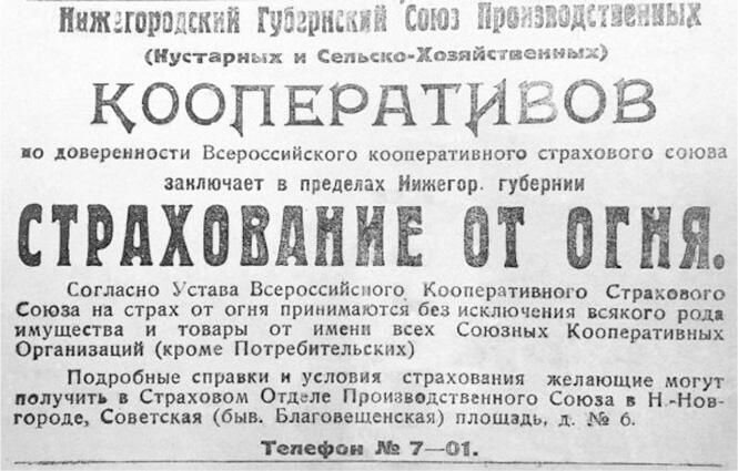 Так, еще до организации Госстраха в некоторых местах губернии предпринимались попытки создания волостного коммунального страхования. По данным «Нижегородской коммуны», осенью 1921 г. вопрос об этом поднимался в Борской волости. «Основными принципами страхования, по мысли волисполкома, должны быть: взаимное несение убытков, причиняемых пожарами всеми членами коммунального страхования, обязательность для всех домовладельцев волости участвовать в страховании», сообщала главная губернская газета в номере от 3 ноября. При этом капитал, гарантирующий выдачи премий погорельцам, составлялся из паевых взносов[2].