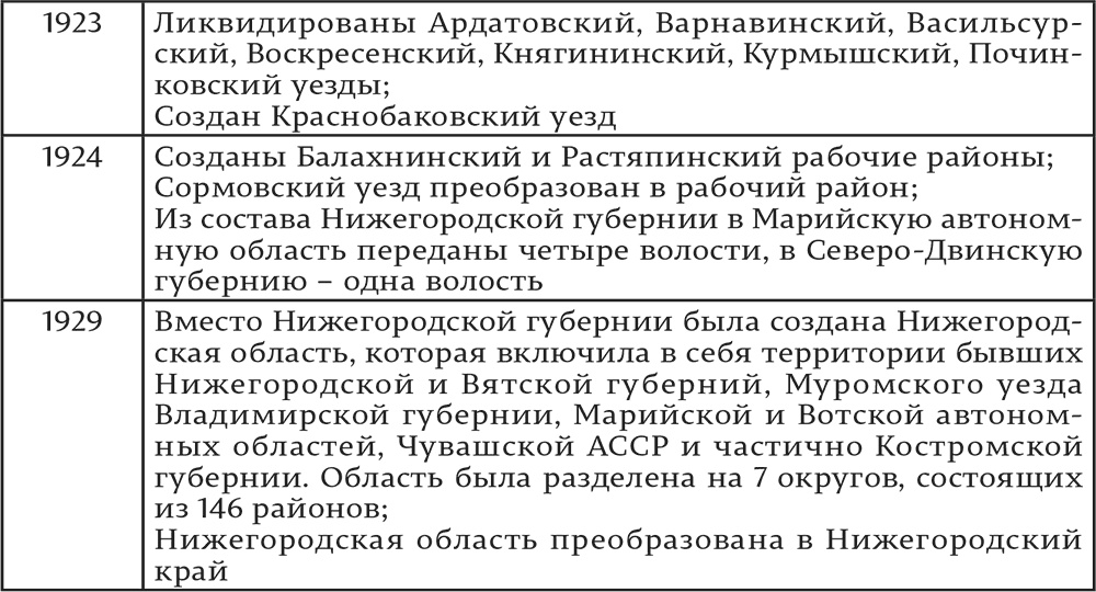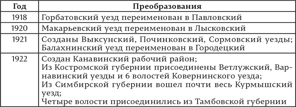 Начиная с 1918 г. и в 1920-х годах внешние и внутренние административные границы в губернии не раз менялись. Согласно путеводителю по фондам Государственного архива Нижегородской области[8] это выглядело следующим образом: