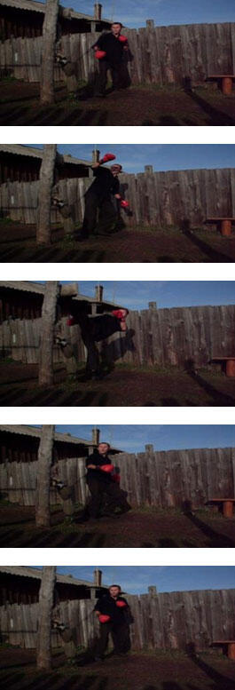 Здесь показано, как я отрабатываю быстрое движение вперед с приемами, для отработки ударов ногами на специальном манекене.