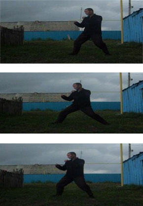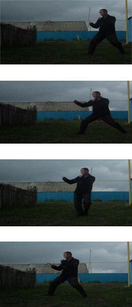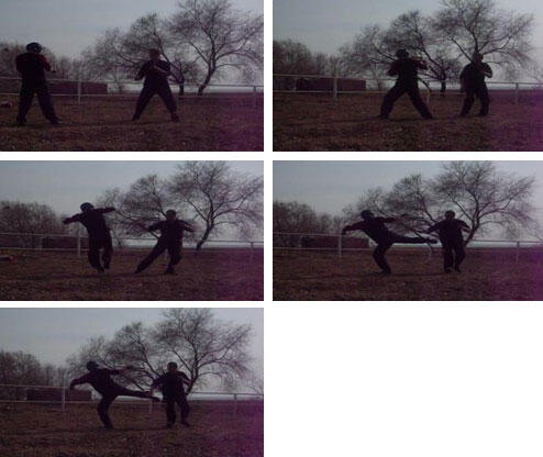 Спурт (выпад)Из положения наготове я делаю шаг вперед ведущий ногой и оттолкнувшись вперед ведущей ногой, задняя нога отрывается от земли, делая прыжок, как показано на фото 3. Как только приземлившись на левой ноге, я сразу же наношу боковой удар ногой по защитному щиту, который держит партнер.