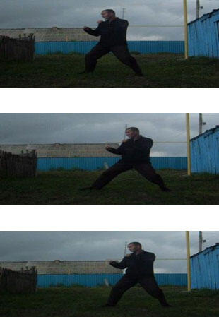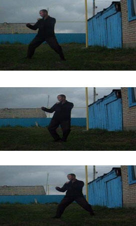 Скольжение впередИз положения «наготове» сделайте скольжение вперед правой ногой на полшага, затем продвигайте скользящим движением левую ногу. Как только вы продвинули левую ногу, вы должны находиться в положении «наготове».
