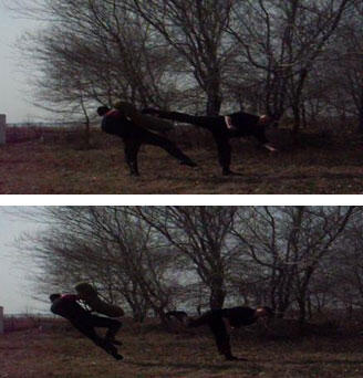 Здесь показано как я делаю быстро отход назад от бокового удара ноги партнера.