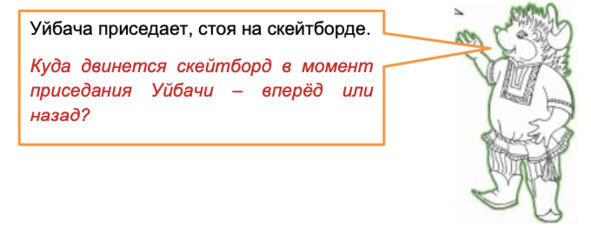 Когда он будет приседать, мускулы увлекут его туловище назад, а ноги, по закону ИНЕРЦИИ, потянутся вперёд. Тогда давление на тело уменьшится, а скейтборд укатит вперёд. Уйбаче придётся догонять.