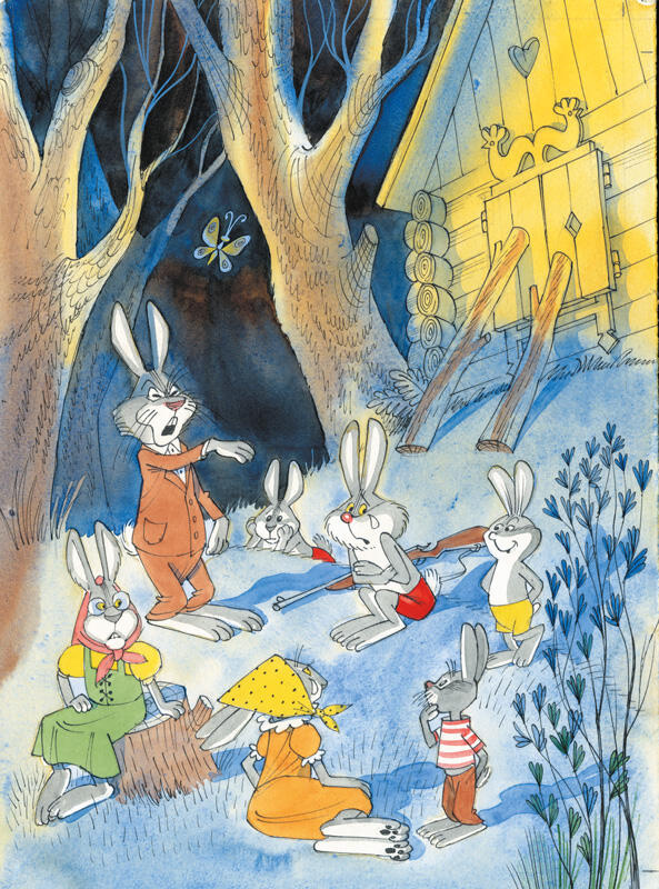 Вылезли Лиса с Волком на крыльцо. Лапы кверху подняли, стоят ждут, что им дальше делать прикажут. Притаились Зайчихи с Зайчатами, ждут, чем всё это кончится.