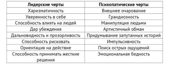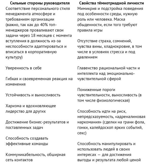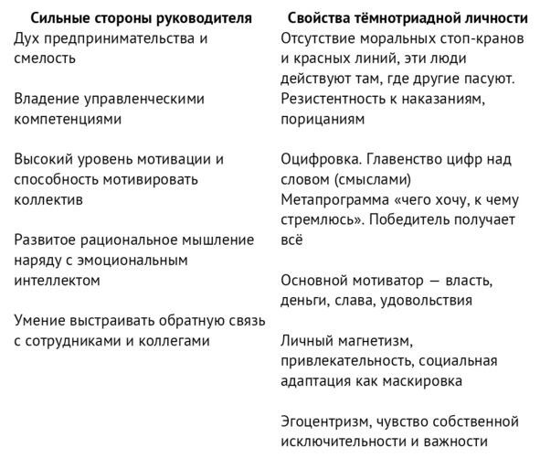В таблице ниже в левую колонку я поместила описания качеств руководителя с сайтов программ развития лидерства у руководителей высшего звена. В правой колонке свойства личности тёмнотриадника. (Подробнее о представителях тёмной триады говорится в разделе «Кто все эти люди?». )