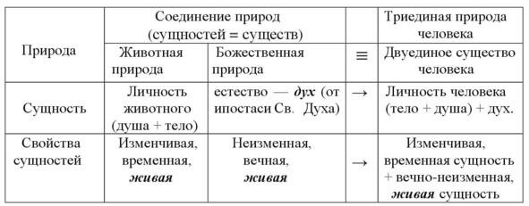 Мы говорим здесь: образовалосьдвуединое существо человека, имея в виду две живые природы (сущности): животную природу и природу Бога. И это новое существо (человека), сохраняя в себе свойства исходных природ (сущностей), является отличной от той и другой. Изменчивые и временные свойства животной сущности человека, соединившись с Божественным естеством, претерпели изменение. Душа, будучи изменяемой и временной, соединившись с духом, стала вечной (бессмертной) и после смерти тела становится неизменной. Но в целом природа человека всё же триедина, ибо соединяет в себе три ипостаси: тело, душу и дух, три разноприродные энергетические сущности: материю, эфир и дух. Св. Писание о триединой природе человека говорит словами Ап. Павла (1Фес. 5:23).