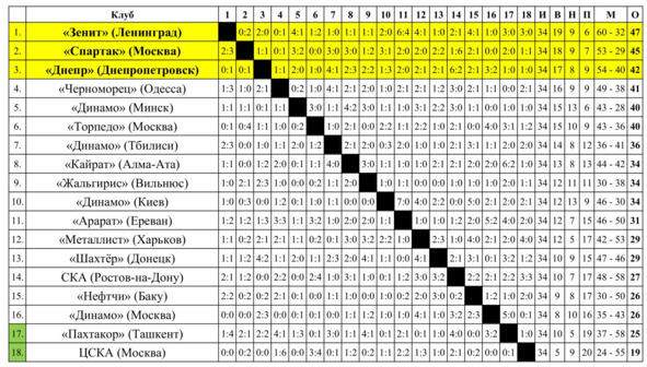 Чемпион «Зенит» (Ленинград): М. Бирюков (в, 34), В. Брошин (32, 4), А. Степанов (32, 2), Ю. Желудков (31, 17), С. Дмитриев (30, 8), В. Клементьев (29, 10), А. Афанасьев (28, 1), С. Веденеев (28, 1), Б. Чухлов (28, 7), А. Давыдов (27, 1), В. Долгополов (27), С. Кузнецов (22), В. Мельников (21, 3), Д. Баранник (19, 1), В. Золин (13), Н. Ларионов (9, 2), Н. Воробьев (8), Ю. Герасимов (7, 1), А. Захариков (6), Г, Тимофеев (6), И. Комаров (5, 2). Старший тренер П.Ф.Садырин.