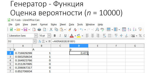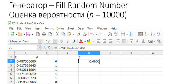 Когда мы вызываем генератор через функцию, электронная таблица пересчитывает все значения при любых изменениях, при обновлении таблицы и при сохранении файла. Все оценки будут вокруг теоретического значения 0,5, но все будут немного разными плюс-минус.
