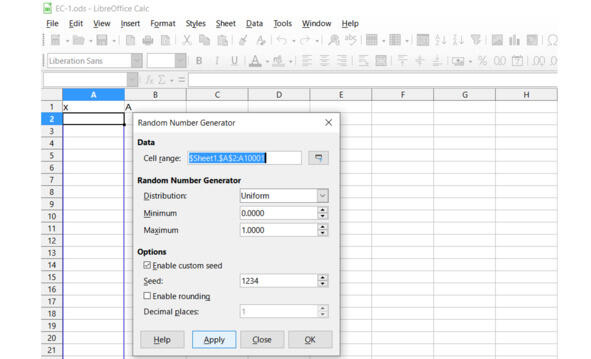 Появляется меню настройки генератора случайных чисел, см. рис. Выбираем равномерное распределение: Distribution Uniform. Значения Minimum / Maximum: от нуля до единицы. Диапазон адресов ячеек Cell range А2:А10001. Как видим, здесь у нас имеется дополнительная галочка Enable custom seed, если мы вручную задаём начальное состояние генератора.