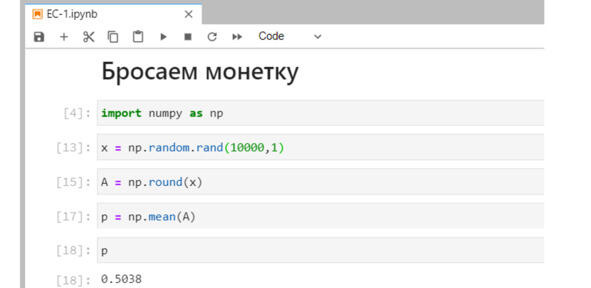 В результате мы тоже получили оценку вероятности около 0,5. И тоже с небольшой погрешностью. И эта случайность тоже заметна при многократном повторении опыта.