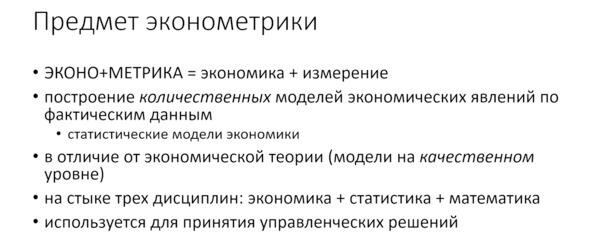 Эконометрика занимается построением моделей. Мы рассмотрели пример такой модели в виде уравнения, но в среднем.
