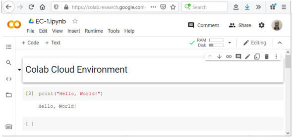 Мы запускаем этот самый инструмент под названием Колаб. Создаем новый блокнот и запускаем нашу «игрушечную» программу, которая говорит: «Всем привет!»