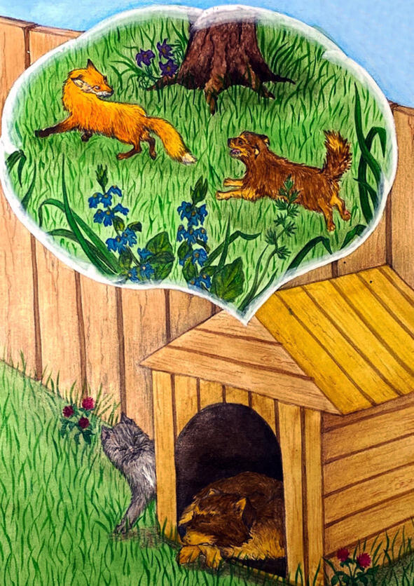 Выглянуло солнце. Щенок вылез из конуры подсушить свою грязную шерсть и вдруг услышал за воротами незнакомый собачий лай. Любопытство заставило Жулика «пролезть в подворотню». Он увидел: на его придомовой территории стоит пёсик примерно такого же возраста, что и он.