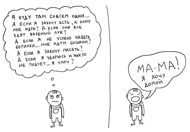 Хуже, чем остаться без мамы, может быть только необходимость остаться совсем одному. «Совсем один» страшнее, чем «без мамы». Ребенок не должен идти просто в садик. Он должен идти к человеку, который будет заменять ему маму. Это придает спокойствие и уверенность: «Этот человек обо мне позаботится, поможет мне».