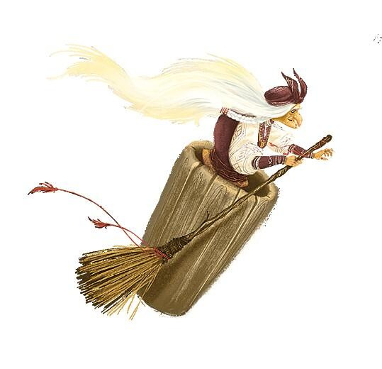 Баба-яга скорее села в ступу, пестом погоняет, помелом след заметает, мчится в погоню за девочкой.