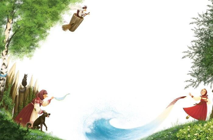 А девочка приложила ухо к земле и слышит, что Баба-яга за ней гонится и уже настигает её. Бросила поскорее девочка полотенце. Полотенце растянулось, и разлилась река широкая и глубокая.