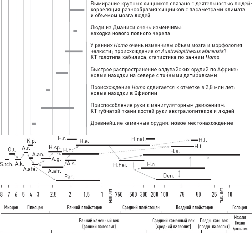 * В начале этой и семи следующих глав приведены схемы, помогающие сориентироваться в изложенных фактах и вписать их в общий контекст. Показанные на схемах интервалы существования видов, так же как и связывающие их стрелки (кто от кого произошел), не являются истиной в последней инстанции. Многие из них указаны очень приблизительно и предположительно. Как датировки, так и родственные связи продолжают пересматриваться и уточняться. Условные обозначения: S.tch. Sahelanthropus tchadensis, O.t. Orrorin tugenensis, A.k. Ardipithecus kadabba, A.r. Ardipithecus ramidus, K.p. Kenyanthropus platyops, A.an. Australopithecus anamensis, A.afa. Australopithecus afarensis, A.g. Australopithecus garhi, A.afr. Australopithecus africanus, H.sp. древнейшие представители рода Homo, Par. парантропы (они же массивные австралопитеки), H.h. Homo habilis, A.s. Australopithecus sediba, H.r. Homo rudolfensis, H.e. Homo erectus, H.hei. Homo heidelbergensis (в самом широком смысле), H.n. Homo neanderthalensis, H.s. Homo sapiens, Den. денисовский человек, H.nal. Homo naledi, H.f. Homo floresiensis (хоббиты с острова Флорес), H.l. Homo luzonensis (карликовые люди с острова Лусон).