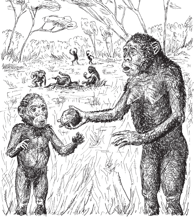 Рис. 1.1. В 2009 году в Эфиопии в слоях возрастом 3,4 млн лет вместе с костями австралопитеков были найдены кости животных со следами каменных скребков. После этого австралопитеков стали изображать с каменными орудиями.