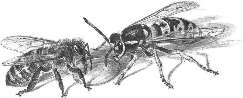 Следующий важный отличительный признак жало. В то время как обыкновенные осы и шершни способны жалить по многу раз и пускают жало в ход при охоте, медоносные пчелы могут использовать свой жалящий аппарат лишь однажды и не для нападения, а только для защиты[11]. Медоносная пчела платит за применение жала жизнью, умирая спустя один-два дня. У медоносной пчелы на жале есть зазубрины, поэтому оно застревает при ужаливании (прокалывании кожи человека), и при попытке вынуть его пчела целиком вырывает резервуар с ядом, расположенный в ее брюшке. Это «оружие» нужно в первую очередь для защиты от тех, кто посягает на мед или личинок; к сожалению, иногда от него страдает и человек.