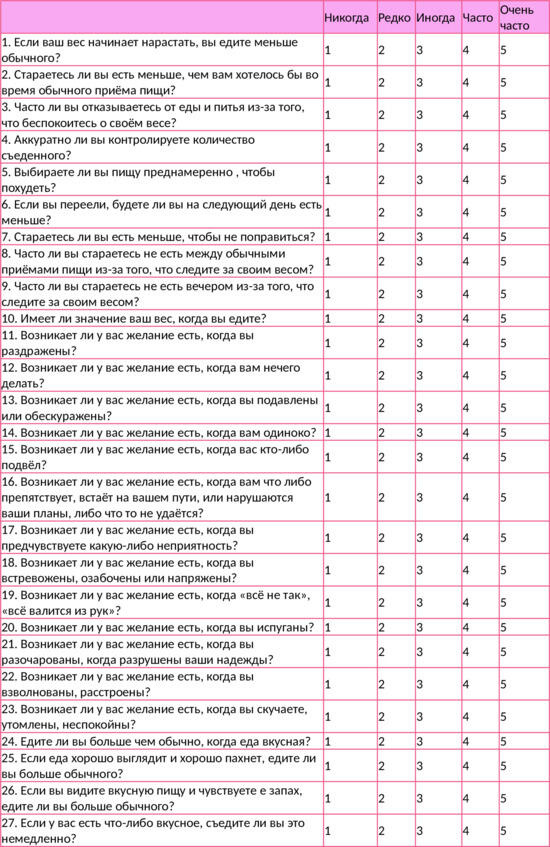 Перед вами ряд вопросов, касающихся вашего поведения, связанного с приёмом пищи. Ответьте на них одним из пяти возможных ответов: