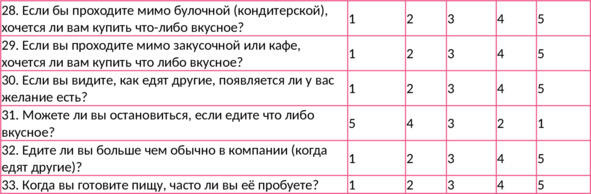 Вопросы 110 составляют шкалу эмоциогенного пищевого поведения (10 вопросов)