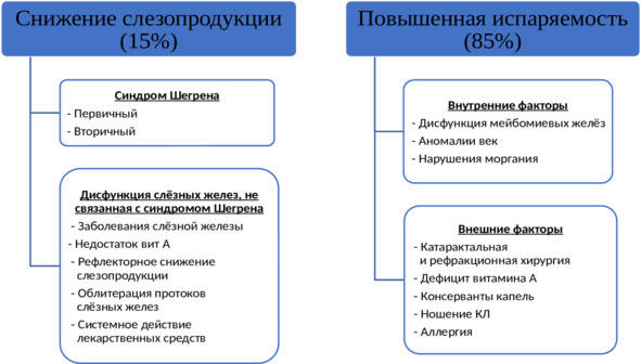 Исходя из особенностей строения слёзной плёнки, формирование ССГ затрагивает несколько звеньев образования и функционирования слёзной плёнки:
