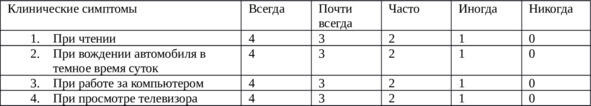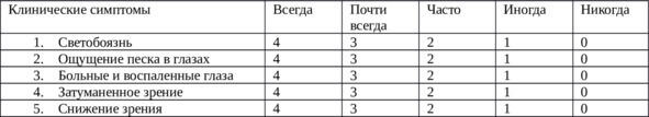 Диагностика ССГ, как и любого другого заболевания, начинается со сбора жалоб пациента, анамнеза истории заболевания, проведения анкетирования по опросникам и непосредственно объективного осмотра переднего отрезка глазного яблока. Необходимо выяснить у пациента пользуется ли он контактными линзами, какие препараты принимает внутрь и местно, был ли ранее поставлен диагноз синдрома сухого глаза и какие препараты принимал пациент, какие имеются сопутствующие заболевания. Существует несколько опросников по диагностике ССГ, наиболее известен OSDI (Индекс поражения поверхности глаза (опросник OSDI), Allergan Inc). Опросники позволяю экономить время, оценить тяжесть и эффективность лечения. Ниже приведен опросник OSDI, ответив на вопросы опросника, с помощью ключа к опроснику, можно выявить у пациента признаки синдрома сухого глаза той или иной степени тяжести.