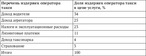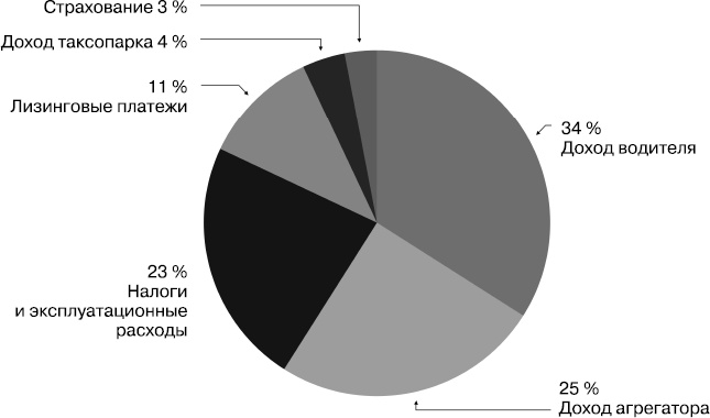 «Таксуй, пока молодой» так начинается заголовок статьи[48] А. Волобуева, опубликованной в газете «Известия» 11 января 2020 года. Водитель такси в Москве, говорится в ней, может заработать 2025 тысяч рублей в месяц при стандартном восьмичасовом рабочем дне. Меня статья заинтересовала тем, что в ней описана примерная структура создания добавленной стоимости в такси. Так, при 300-часовом графике работы водителя в месяц, согласно приведенным данным, по 3 % затрат приходится на лизинговые платежи и страхование (каско и ОСАГО), 4 % составляет доход таксопарка, 8 % возмещение стоимости машины, взятой в лизинг. Налоги и эксплуатационные расходы съедают еще 23 %. Чистый доход таксиста, согласно статье, порядка 34 % от выручки, а 25 % получает агрегатор (табл. 1.7 и рис. 1.3).