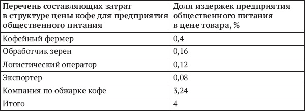 Кроме того, авторы упомянутой статьи распределяют затраты на кофе между всеми участниками цепочки поставок кофейным фермером, обработчиком зерен, логистическим оператором, экспортером и компанией по обжарке кофе (табл. 1.9).