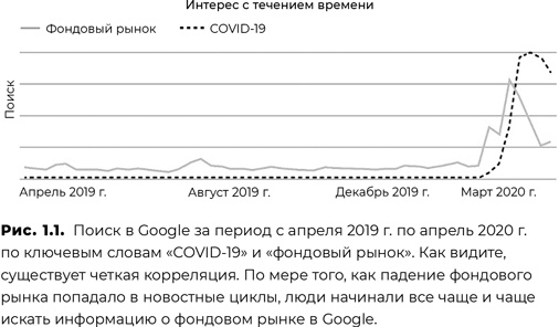 Ответ нашелся в Google Trends, как показано на рис. 1.1. С наступлением пандемии COVID-19 фондовый рынок начал снижение по мере осознания реальности экономического спада и глобальной рецессии. Распродажа ценных бумаг, растущая безработица и надвигающаяся рецессия эти темы появлялись в лентах новостей ежедневно. После 11 лет непрерывного бычьего рыночного тренда (начавшегося после финансового кризиса 20072008 гг.) переход к медвежьему рынку, вызванному пандемией и угрозой рецессии в 2020 г., для многих трейдеров и инвесторов стал первым в их истории биржевой торговли. И именно поэтому я получал так много писем и просьб о помощи. Люди находились дома, часто в условиях изоляции, и, соответственно, имели больше свободного времени. Финансовый кризис присутствовал в каждом выпуске новостей, и людям хотелось узнать об этом побольше. Многие находились в поиске информации о рынках. Даже если человек не работает в банке, не имеет брокерского счета, практически вся его жизнь, так или иначе, соприкасается с событиями, происходящими на Уолл-стрит и других международных финансовых рынках.
