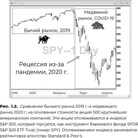 Волатильность рынка весной 2020 г., конечно же, возникла в результате пандемии COVID-19, которая привела к ужасно болезненной глобальной рецессии, как показано на рис. 1.2 при сравнении бычьего рынка 2019 г. и медвежьего рынка 2020 г. Именно в периоды сильного медвежьего тренда события фондового рынка обычно попадают в заголовки новостей.