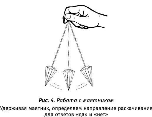 Договориться со своим маятником можно так: разместите его над вашим коленом и спросите: «Мое имя (ваше имя)..?» направление, в котором он начнет качаться, будет означать «да». Затем, чтобы определить направление, означающее ответ «нет», спросите: «Мое имя (чужое имя)..?». Также вы можете сами запрограммировать маятник на ответы «да» и «нет», несколько раз качнув его в определенном направлении, уверенно скажите «да», качнув в другом произнесите «нет» (см. рис. 4).